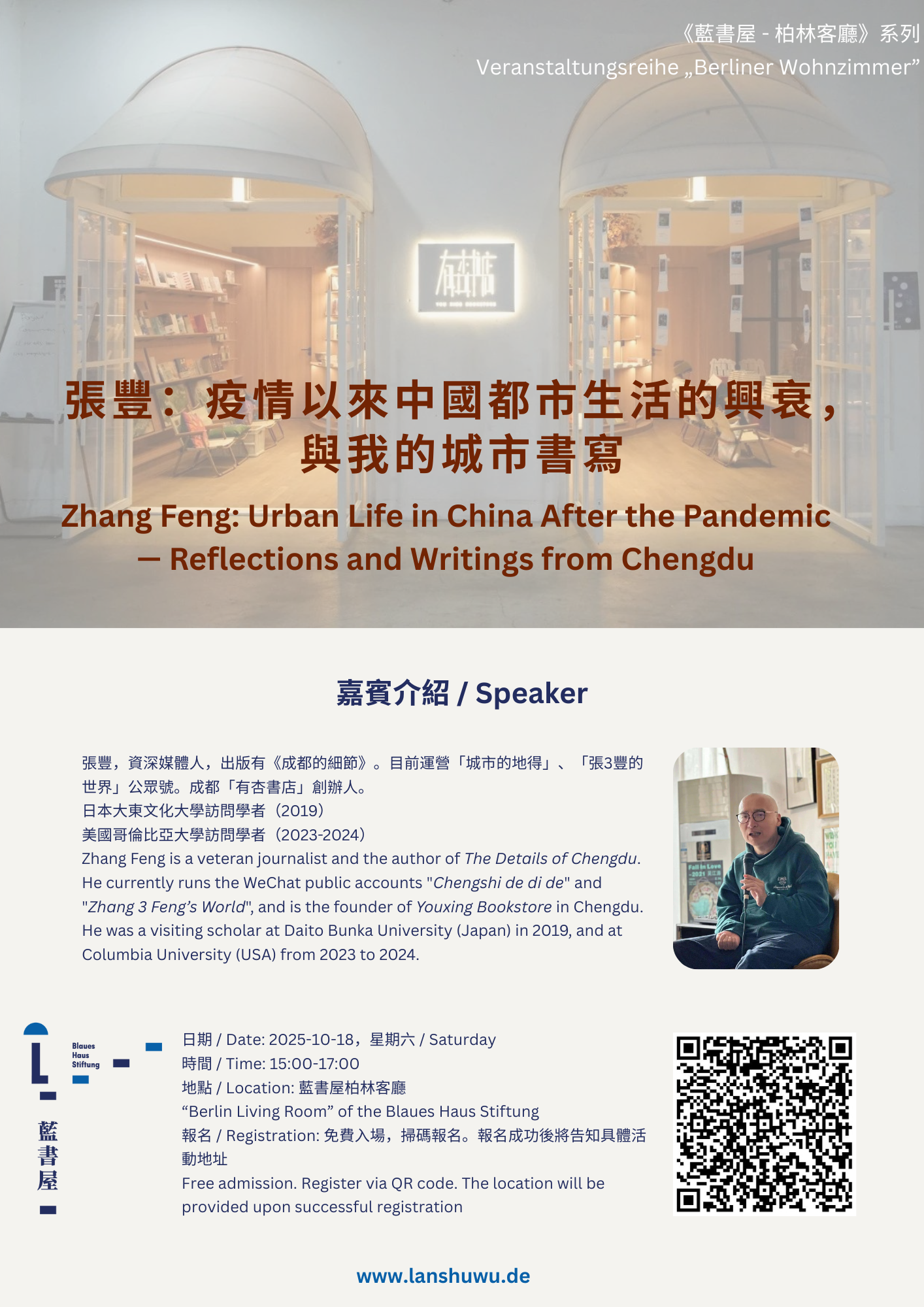 继10月1日汉诺威蓝书屋图书馆的分享后,2025年10月18日,蓝书屋邀请到张丰来访柏林客厅,和柏林的朋友们分享他的书写与实践。