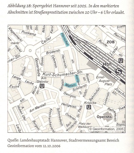 自2005年起的汉诺威限制区,标示区域内允许街头性工作时间为晚间20点至翌日6点。(图源:汉诺威市政府,城市测量局地理资讯部,2006年10月12日)